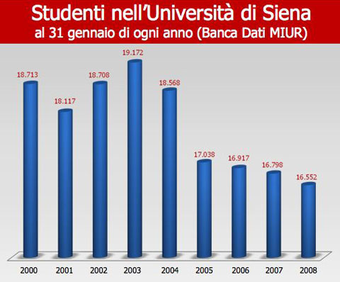 Il piano di risanamento già approvato dagli organi di governo dell’Ateneo senese dovrà tenere conto anche del calo costante e inesorabile, iniziato nel 2001, del numero degli studenti. Rispetto al 2000, nel 2008 si sono persi 2161 studenti. I picchi del periodo 2002-2004 non devono ingannare: indicano gli anni in cui sono state approvate le convenzioni per la svendita di lauree sulla base del riconoscimento dei crediti, con l’obiettivo di “far soldi” (e concorrenza al CEPU), con il risultato certo di uno “scadimento dell’offerta formativa”. In tal modo sono stati “svenduti” migliaia di titoli del corso di laurea in Scienze dell’amministrazione e dei corsi triennali della Facoltà di Medicina. Occorre invertire questa tendenza investendo sull’offerta formativa che dovrà caratterizzarsi per qualità della didattica (compresi laboratori e strumenti didattici) e per reclutamento di giovani docenti e tecnici, sotto la guida preziosa di chi, con più esperienza, può dare ancora tanto al nostro ateneo e non dovrà certo essere allontanato, per consentire l’ingresso di altri amministrativi che, già in esubero, non sono centrali nello svolgimento delle attività istituzionali dell’ateneo.