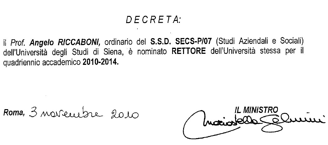 “Sia il nostro statuto che la legislazione vigente mi impediscono infatti di conferire l’incarico al prossimo Direttore Generale per periodi inferiori ai tre anni, a meno di forzature contrattuali di assai dubbia legittimità e trasparenza. Ritenendo peraltro estremamente opportuno, ed eticamente doveroso, assicurare al prossimo Rettore il diritto di scelta del “suo” Direttore Generale, così come garantitogli dallo statuto, ho pertanto deciso di rinunciare al secondo dei due anni di proroga ex lege 240/2010 del mio mandato, che terminerà quindi il 30 settembre prossimo”.