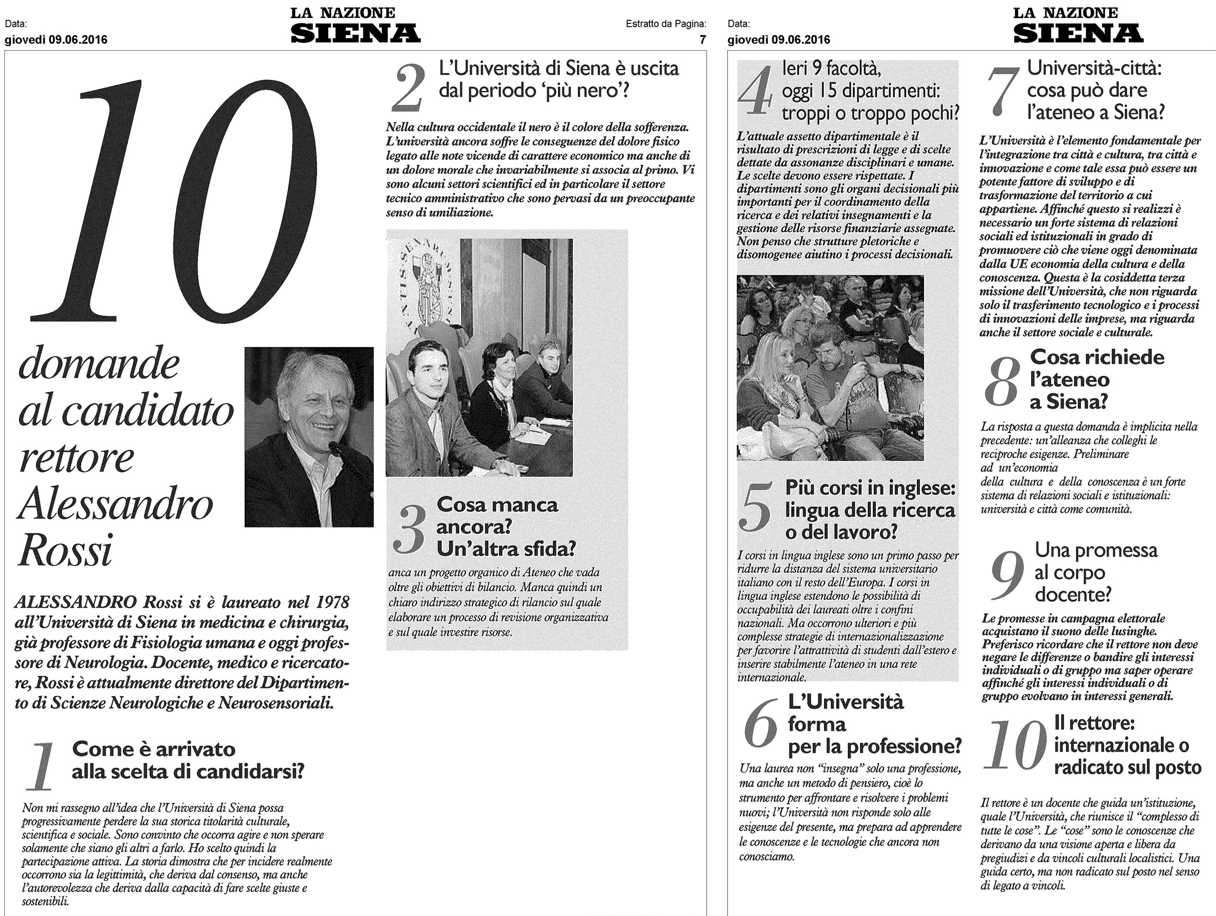 Cosa può chiedere la Città al futuro Rettore? Di resistere a manovre esterne, di politica universitaria e non solo; di mantenersi strette le eccellenze, valorizzarle e potenziarle; di portare l’Ateneo senese ai vertici del panorama nazionale e internazionale; di riorganizzarsi al proprio interno; di legarsi al tessuto cittadino e fare cultura diffusa coinvolgendo le varie realtà della città; di coltivare culturalmente il tessuto sociale di Siena, per renderlo consapevole delle proprie reali potenzialità; di rompere lo stato d’assedio di una inerzia diffusa con una serie di sortite concrete in grado di attivare effetti a catena virtuosi; di saper scegliere una classe dirigente illuminata; di operare per fare della cultura, della tecnologia e della scienza una forza economica di sviluppo e di crescita, stabilendo alleanze con le forze sane del territorio.